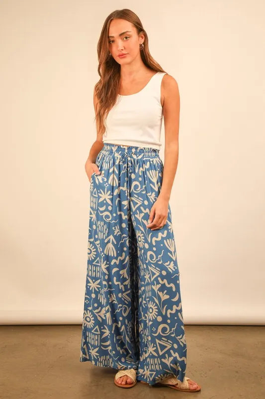 Printed wide leg pants are fashionable bottoms featuring a bold or intricate print that adds personality to your outfit. These pants have a wide leg silhouette that offers a relaxed and flowy fit. Perfect for making a statement and adding a touch of flair to your wardrobe, printed wide leg pants can be dressed up with a blouse or down with a casual top for a versatile and chic look.